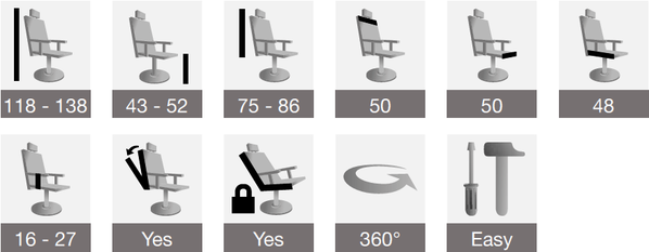 Réglage de la hauteur d'assise par verrin à gaz de 43 à 52 cm.